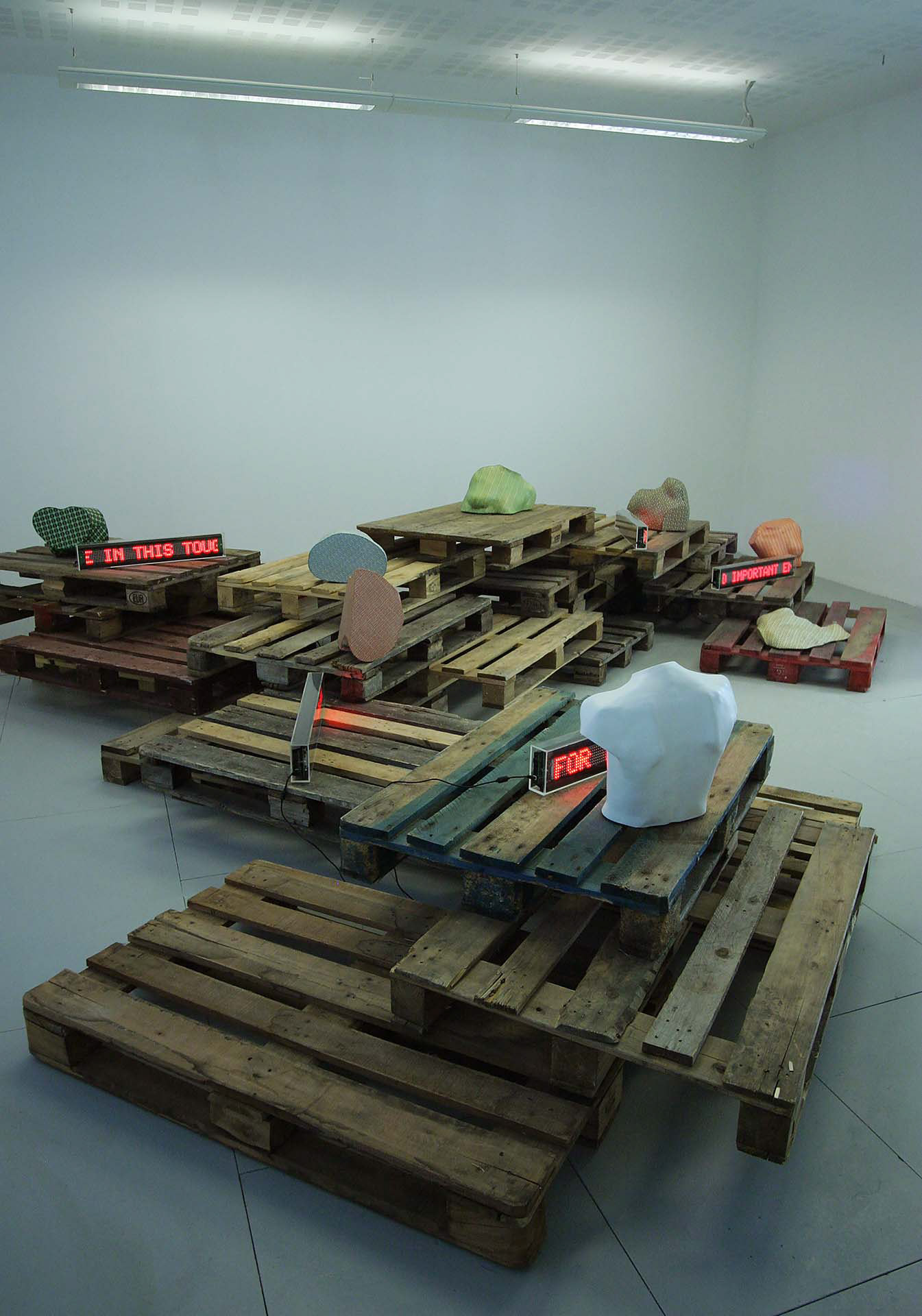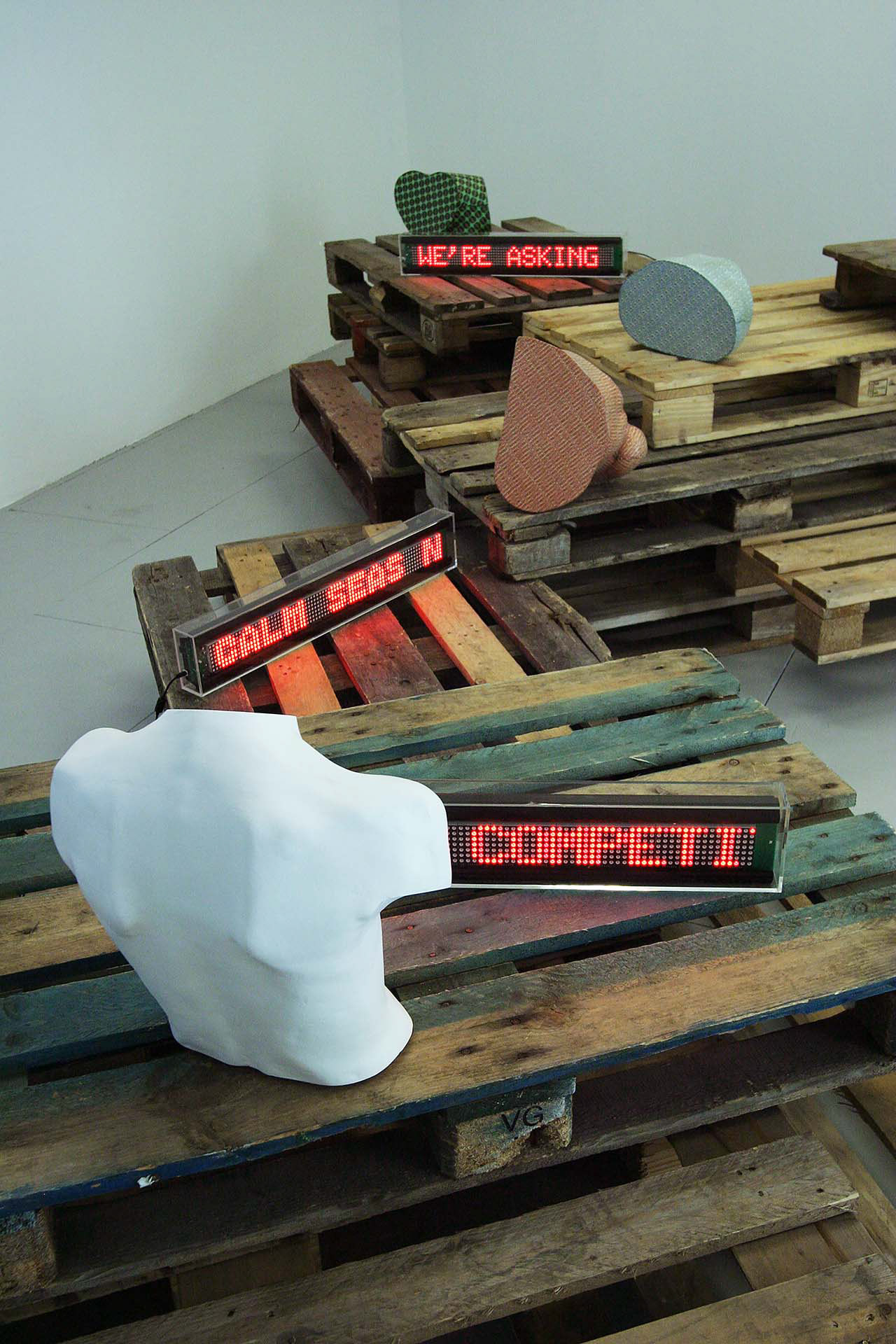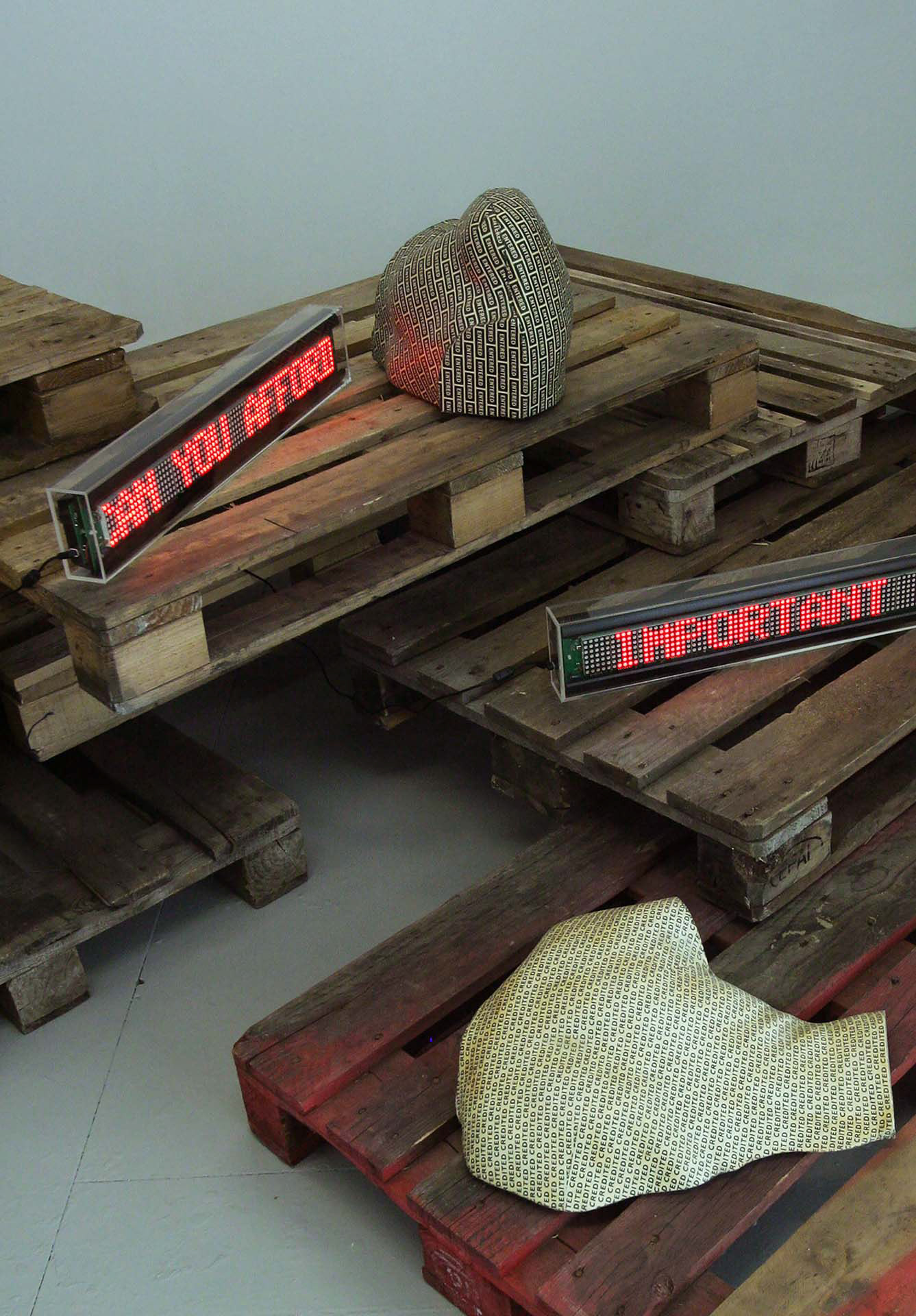 Installation, plaster body casts encapsulated with screen-printed latex, LED scrolling signs, recycled pallets, 2011.