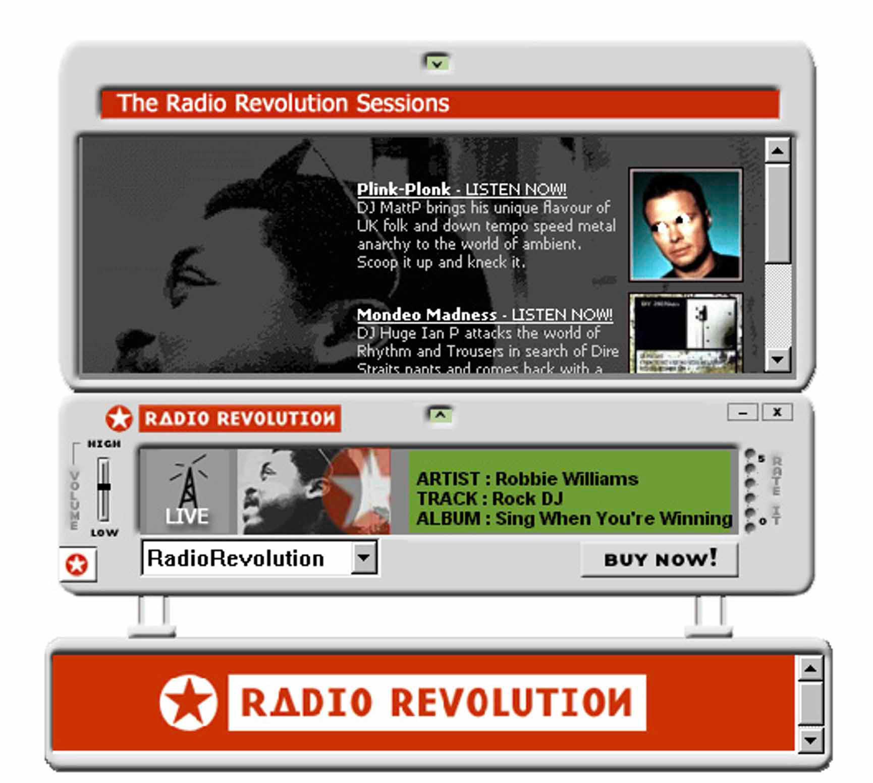 RadioRevolution (2000-2003) built software for the radio and leisure industries including a browser based player that displayed metadata for tracks being played on radio and streaming channels. The player allowed users to instantly purchase music.